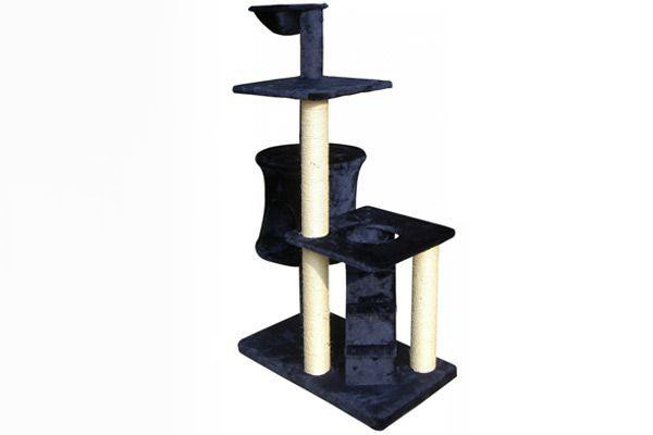 Duvo blauw gekleurde krabpaal Pluto. Complete krabpaal voorzien van diverse plateau's, huisje, trapje en hangmat. Jouw kat kan tot rust komen in zijn eigen speelparadijs. Krabben kan natuurlijk ook op één van de drie sisal stammen met een diameter van 7 cm.